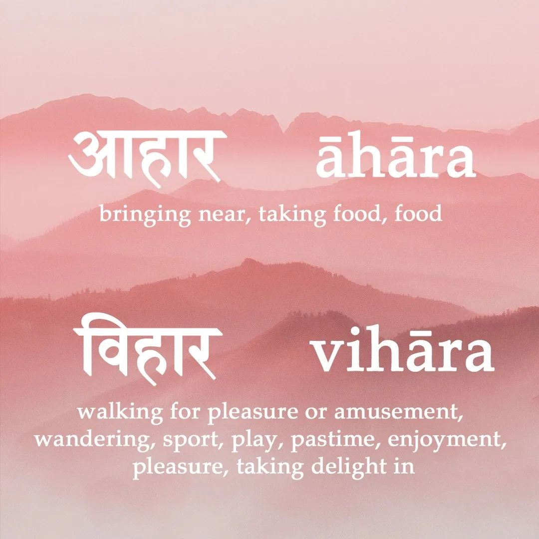 I loved learning about the full meaning of the Sanskrit words āhāra and vihāra in a recent Sanskrit class. These two words are used in Ayurveda to denote diet/food and lifestyle. Both āhāra and vihāra comes from the same seed syllable 'hṛ', which changes to 'hāra' and is related to the action of 'taking or carrying'.
