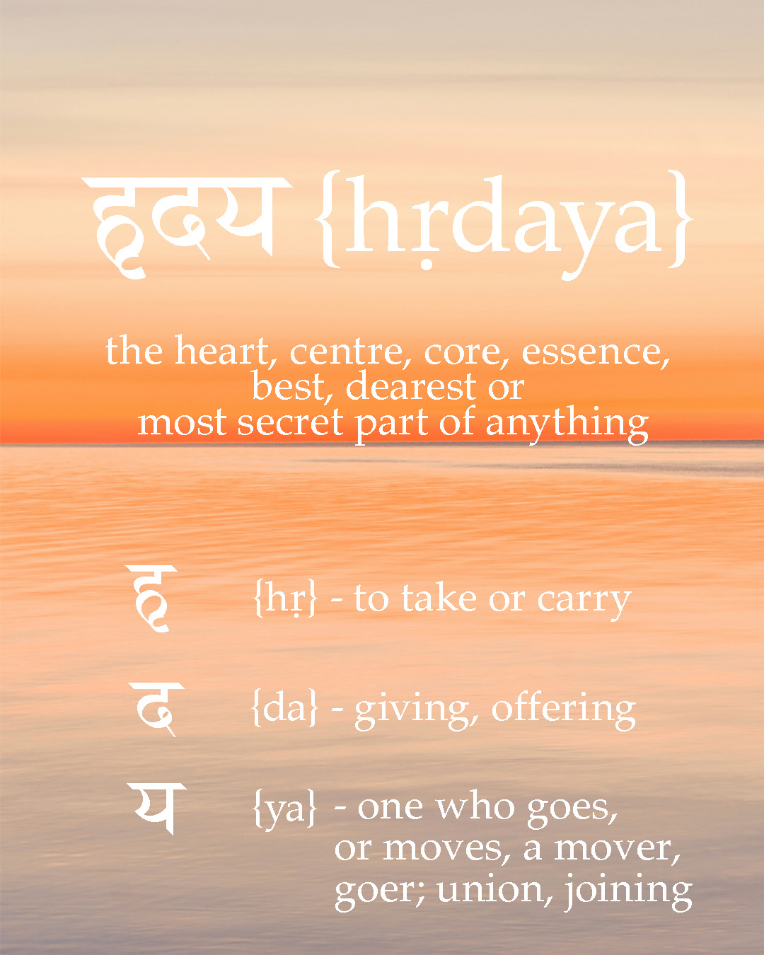 When the term Hrdaya is divided into its root words hr, da & ya it is descriptive of how it receives, releases and moves blood in the body.